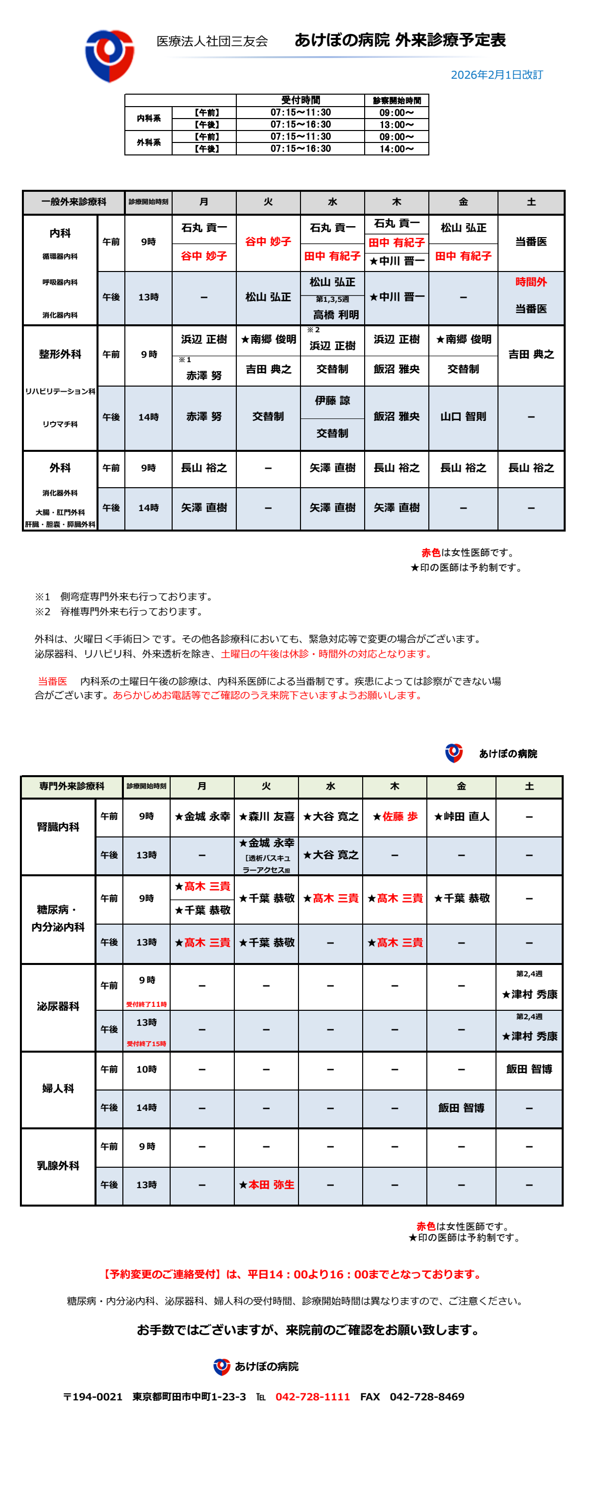 2026年(令和8年)2月1日より外来診療予定が一部変更になりました