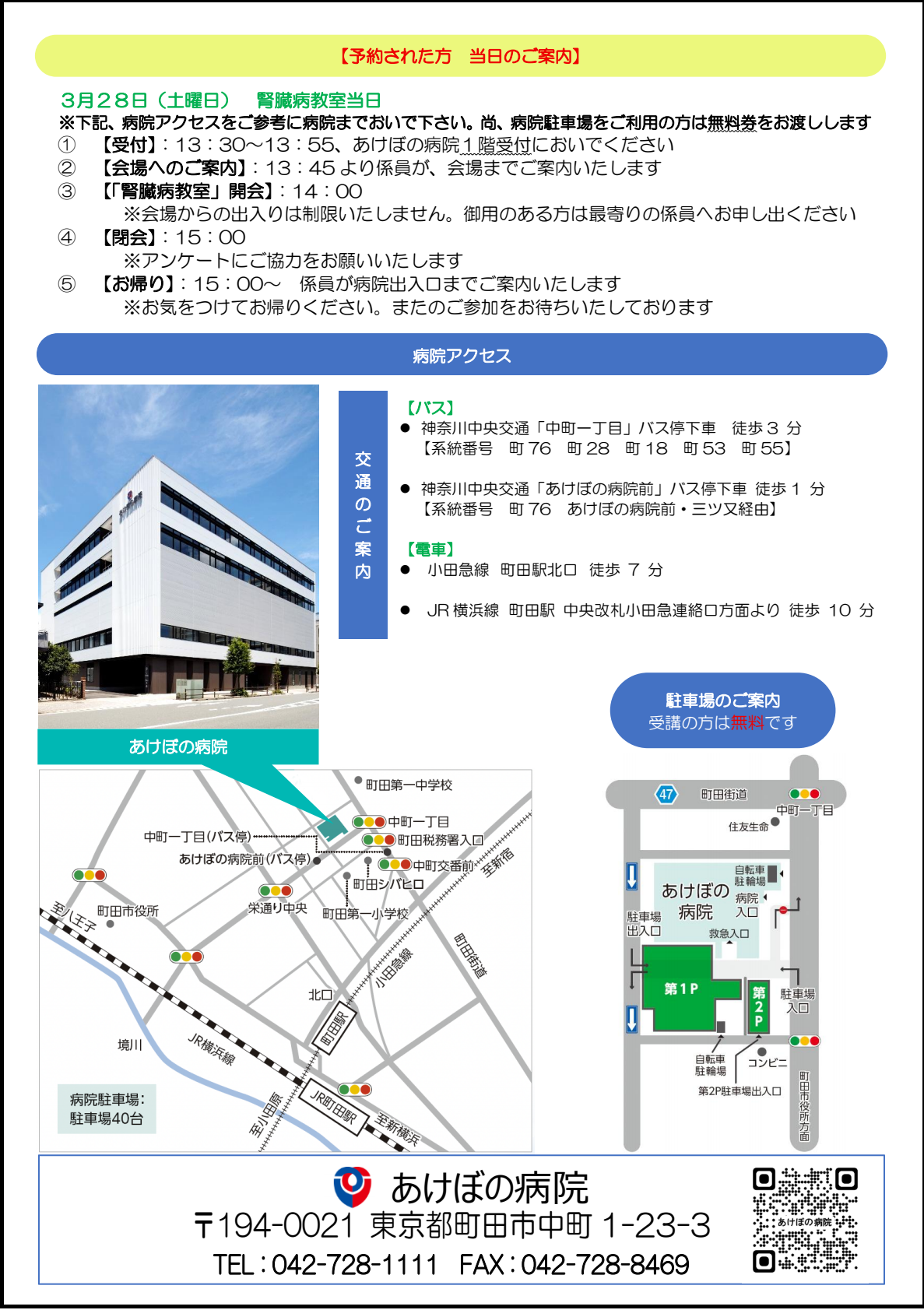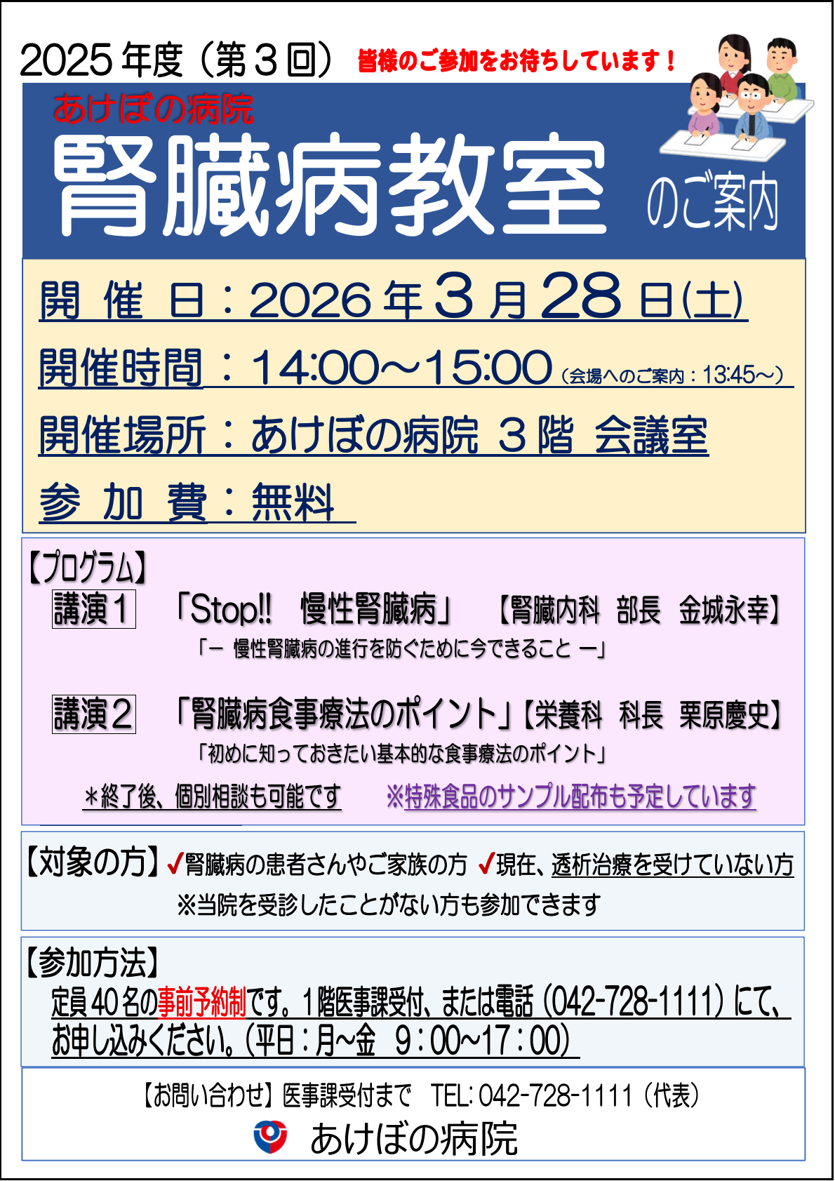 2026年3月28日(土)14:00~15:00 腎臓病教室を開催いたします。